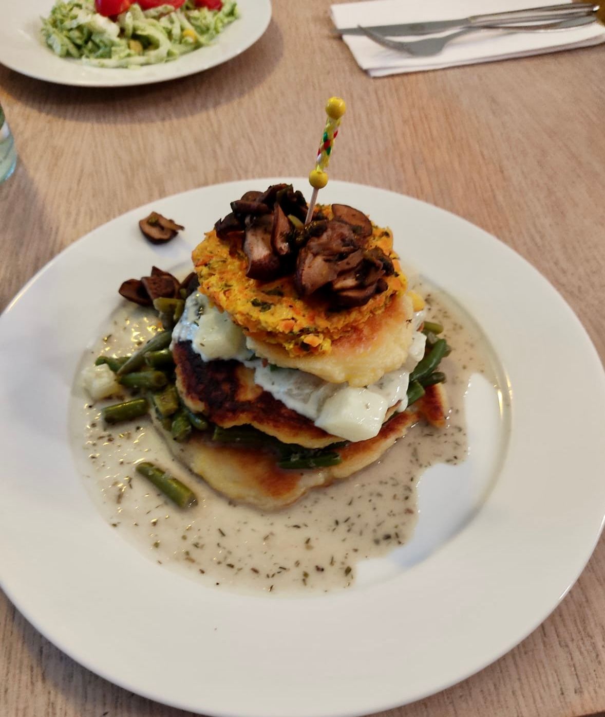 Angeboten wird immer ein vegetarisches und ein Fleisch- oder Fischgericht.